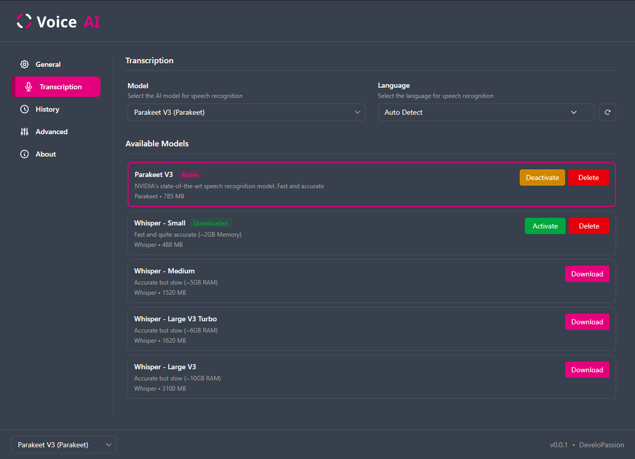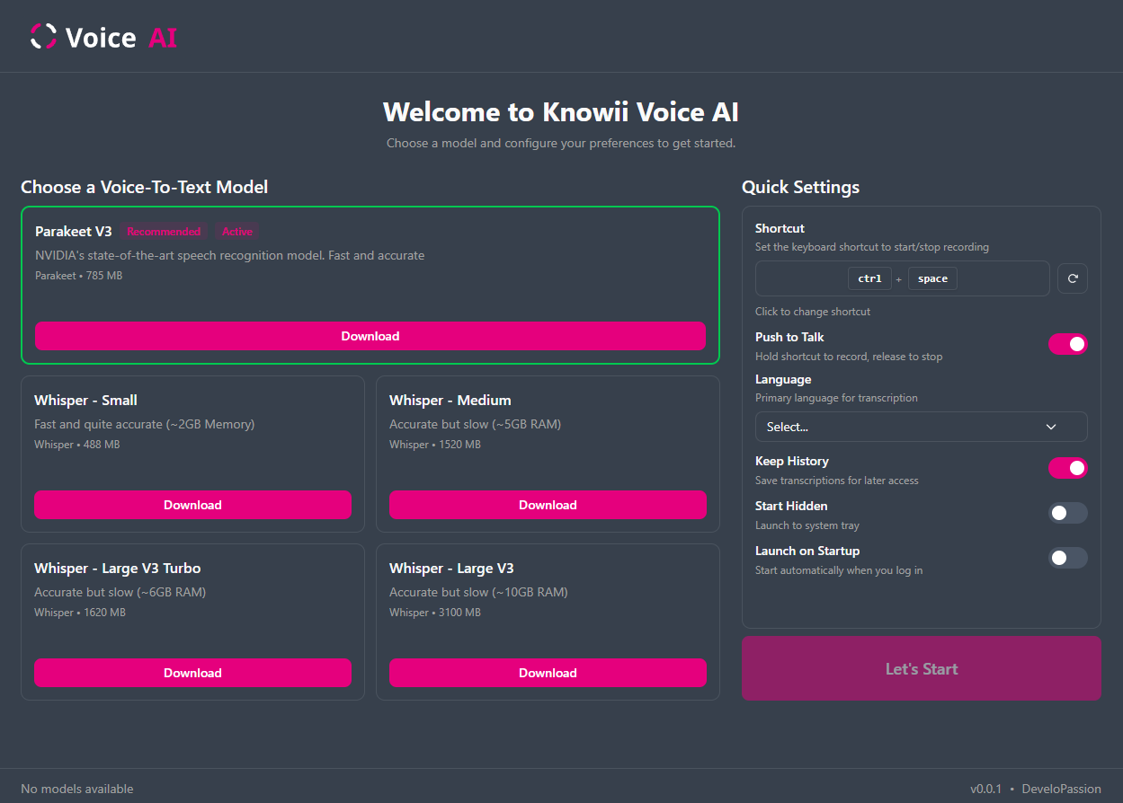 Download a small and fast model if you want near-instant results. Download a larger and more accurate one if you're transcribing technical content or accents and have a powerful-enough computer.